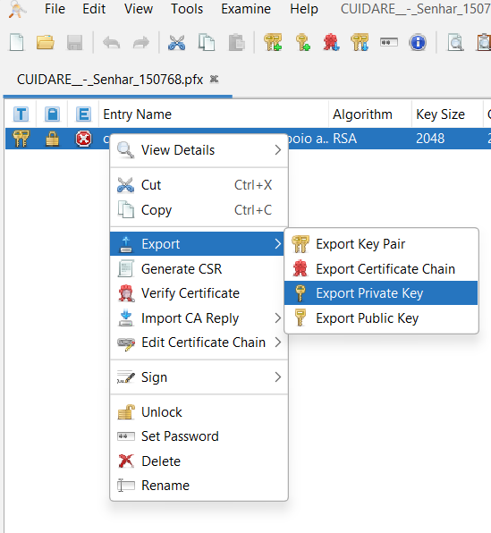 Clique com o botão direito sobre ele e escolha Export > Export Private Key.