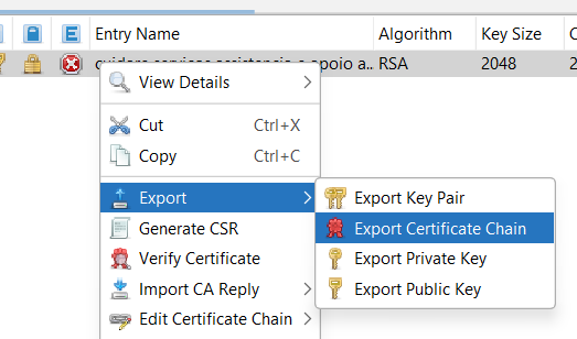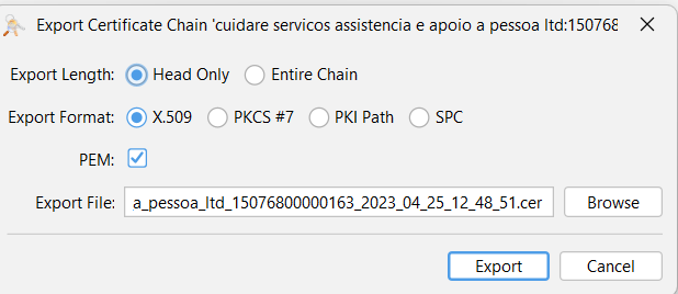 Clique com o botão direito no certificado e escolha Export > Export Certificate Chain.
